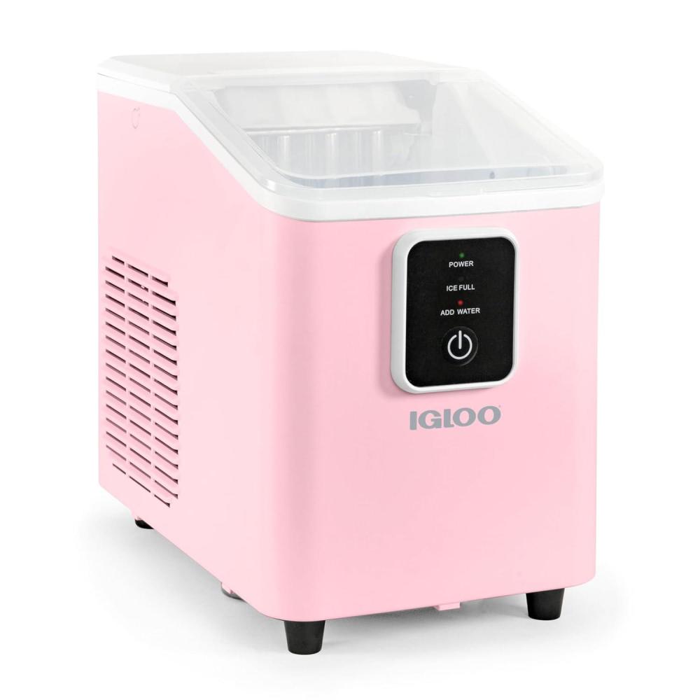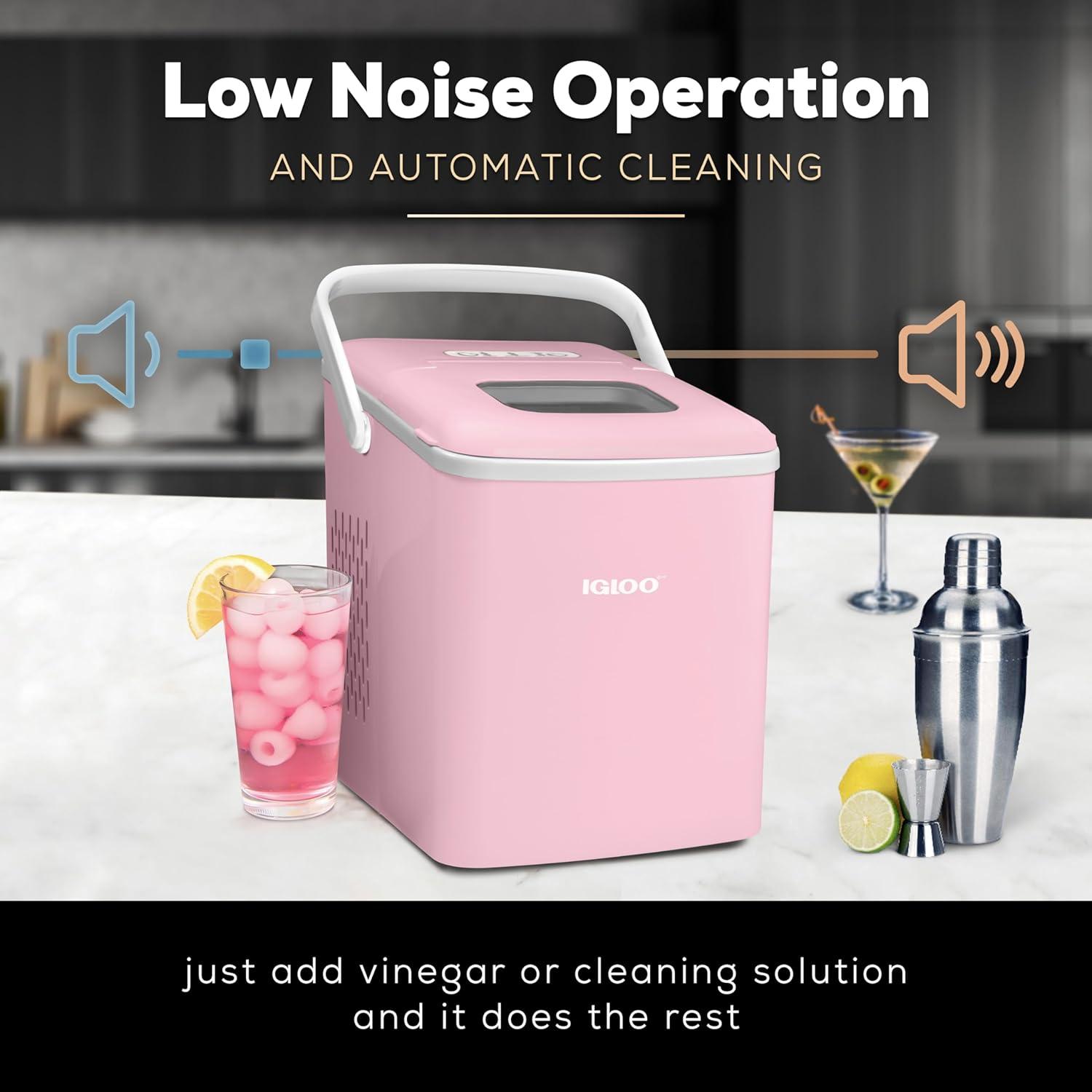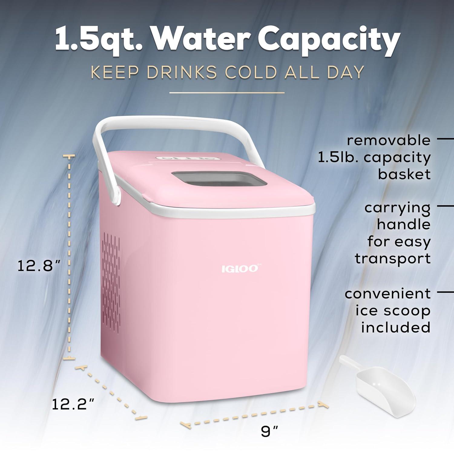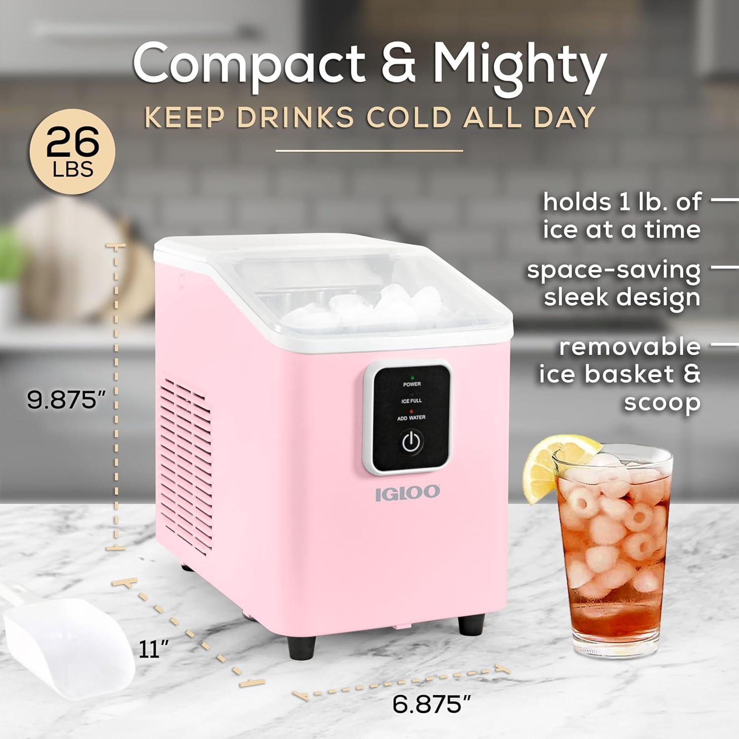 Meet the Igloo Self-Cleaning Countertop Ice Maker, your stylish and portable solution for keeping beverages perfectly chilled! In 7 minutes, you'll have your first batch of ice ready, and in a full day you can make up to 26 lbs. of ice. With a design that's sleek yet compact, you will save a ton of extra counterspace while still producing plenty of ice for keeping drinks cool. Operation is simple with a single-button control panel with LED indicator lights that signal when ice is full or water is needed. The included 1-pound ice basket and ice scoop ensures easy ice serving. The automatic five-cycle self-cleaning function makes clean up easy and allows clean ice to be made every time. Perfect for pool parties, home bars, dorm rooms, offices and more! Cold Drinks. Warm Smiles.