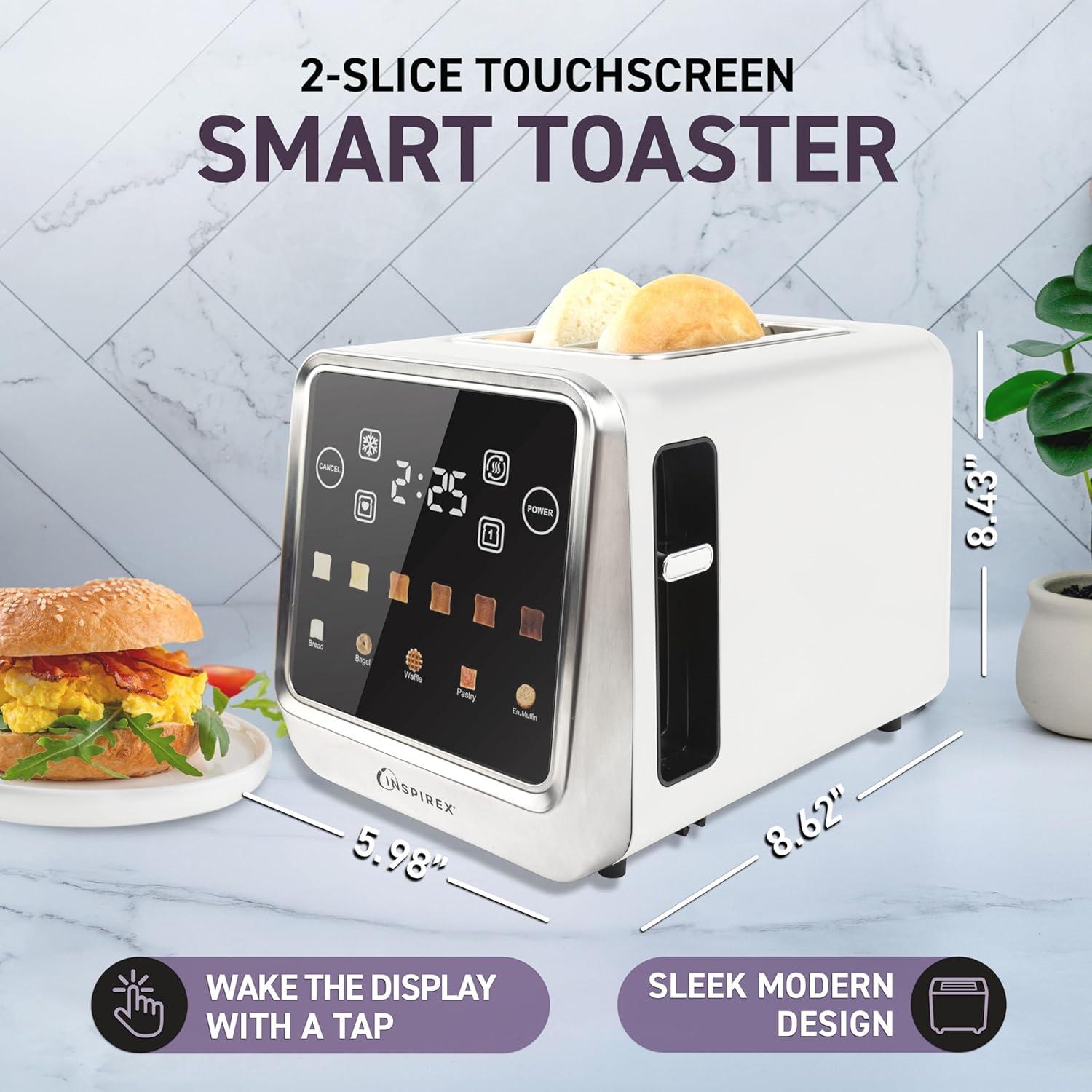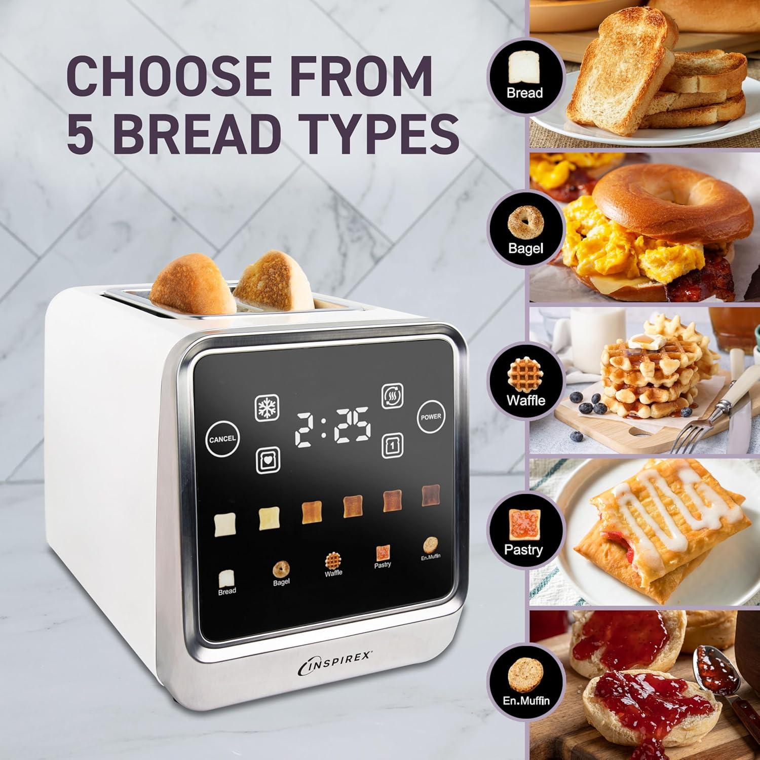 Inspirex Touch Screen Toaster – 4 Slice Long Extra-Wide Slots – 5 Bread Type and 6 Browning Levels – Defrost, Reheat, Favorite, Single Slot Settings – Stainless Steel(White)