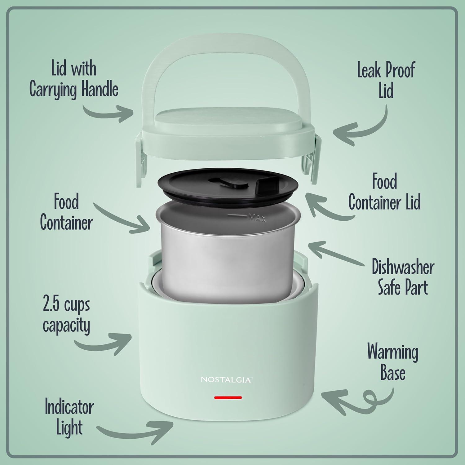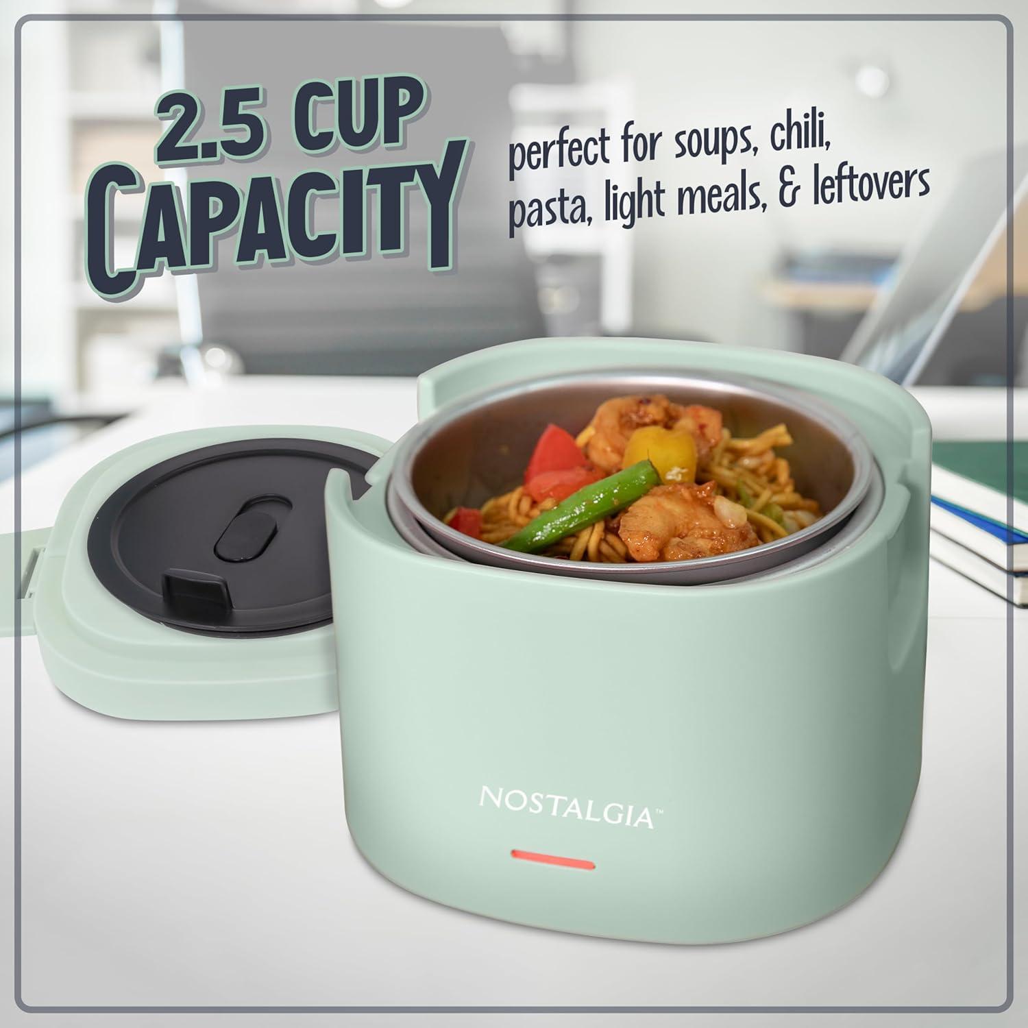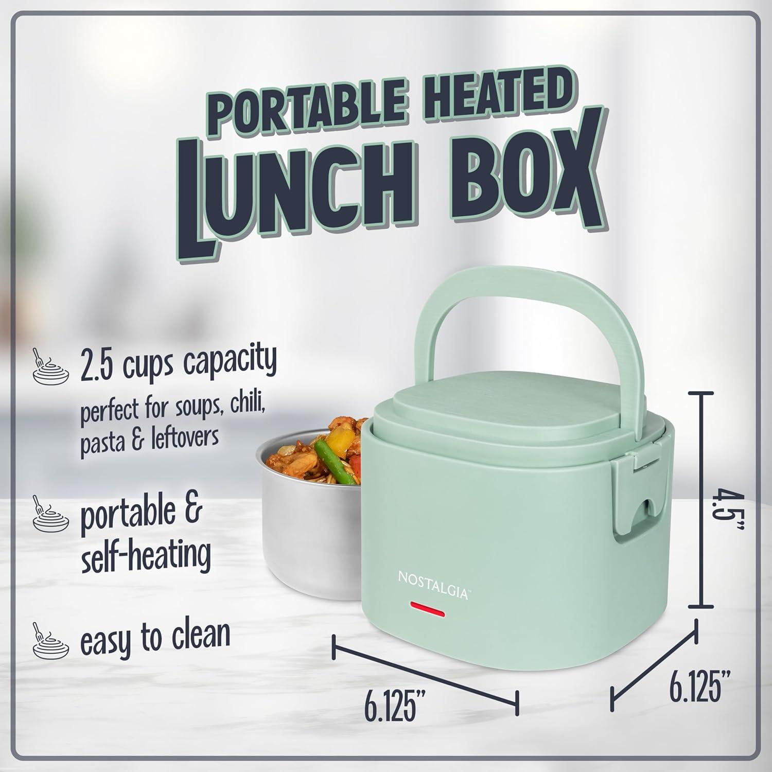 Simplify your lunch routine with the Nostalgia 32-Ounce Portable Heated Lunch Box, the perfect solution for busy days at the office, on the road, or wherever hunger strikes! This versatile travel food warmer allows you to pack, transport, and cook your meals all in one appliance. The stainless steel interior stores up to 4 cups of food such as soup, chili, noodles, leftovers, or more. Just plug the electric lunchbox in before mealtime to heat your food until it’s time to eat, then enjoy a tasty meal without waiting for a microwave. No need to worry about spilling or leakage, as this dual-lidded lunch container is leak-free. Avoid the hassle of cooking a meal at the office or waiting to use the microwave and consolidate everything you need to enjoy a nice hot meal in one self heating lunch box. This reusable and easy-to-clean lunch box is an ideal gift for anyone looking to enjoy homemade meals on the go.
