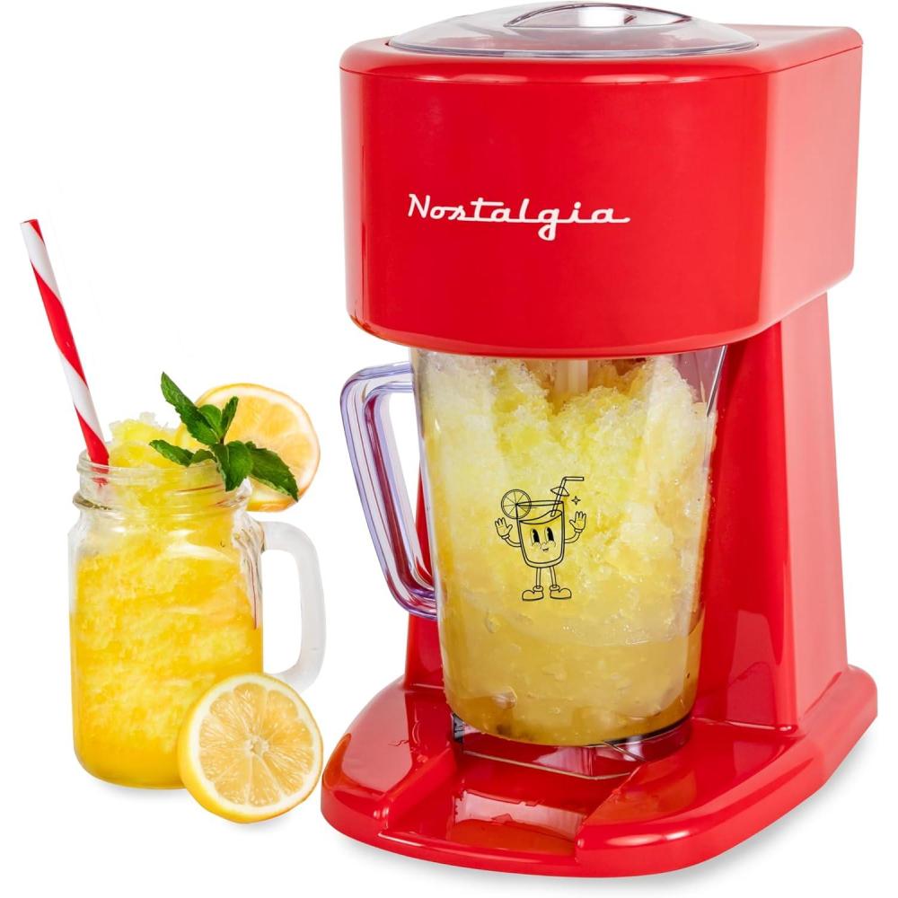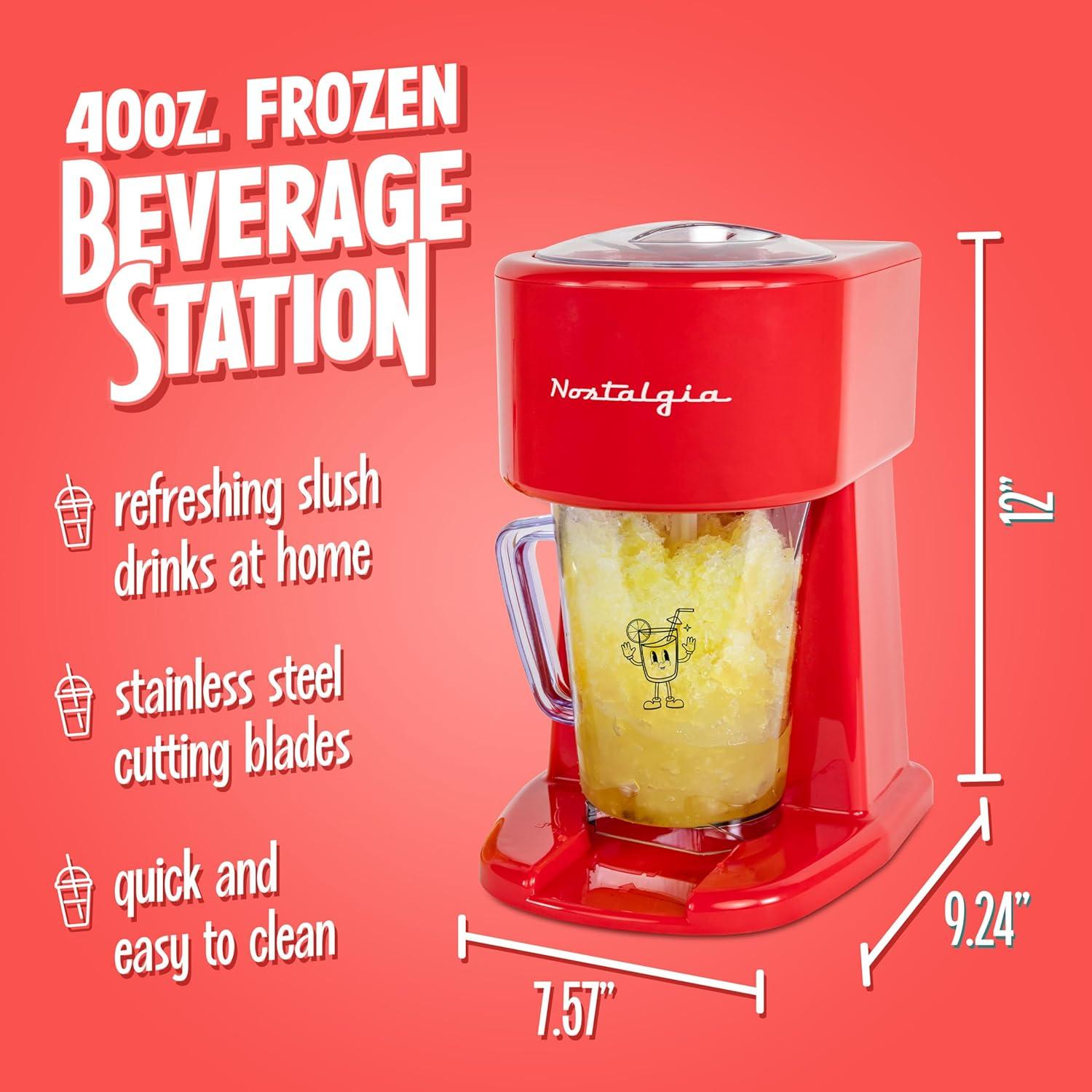 Bring the party to life with refreshingly icy drinks using the Nostalgia Frozen Beverage Station! Entertain guests at pool parties, birthdays and more; the large pitcher serves up to 40-ounces of drinks. Making recipes like slushies, daiquiris, and margaritas is easy! After adding ice and your beverage choice, start shaving with the simple twist of the lid. While the ice is being shaved, the mixing paddle simultaneously stirs the frozen beverage creating a perfectly mixed frozen drink. The precision-cut stainless steel cutting blades equipped with this machine quickly and efficiently shave ice cubes into delicious, fluffy snow-like ice. Get creative with your drink creations and use any of your favorite beverages such as soda, fruit juices, cold coffee and more. The Frozen Drink Maker not only provides tasty refreshments, but adds a fun and unique flair to your countertop setup with its retro design. Making drinks is a blast with Nostalgia!